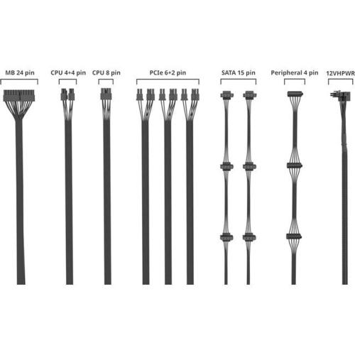 | Connettori | 1x 20/?24 pin, 1x EPS12V a 8 pin, 1x ATX12V 4/?8 pin, 1x PCIe 5.0 12VHPWR a 16 pin (12+4 pin, intero max.: 300 W), 3x PCIe 6/?8 pin, 8x SATA, 4x IDE |