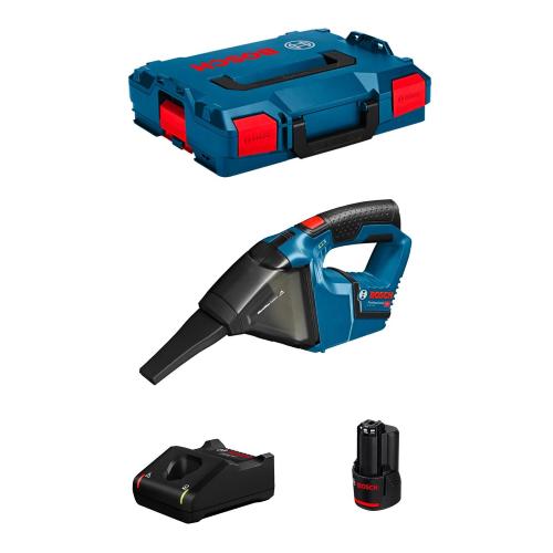 | - Aspiratore BOSCH GAS 12V-LI - Filtro pieghettato piatto - Bocchetta a fessura lunga - 1 Batteria 12V 3,0 Ah - Caricabatterie GAL12V-40 - Valigetta L-Boxx 102 |