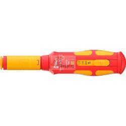 Wera 7508 VDE Kraftform Safe-Torque Speed 0,4-2,0 NmIl cacciavite dinamometrico Wera 7508 VDE Kraftform Safe-Torque Speed è uno strumento isolato VDE per lavorare in sicurezza sugli impianti elettrici. Dispone di cinque valori di coppia preimpostati compresi tra 0,4 e 2,0 Nm, oltre a una funzione di blocco della coppia che consente coppie di rilascio e serraggio illimitate. Grazie al manicotto della ruota libera e al supporto per lame intercambiabili Wera VDE, offre una maneggevolezza precisa e confortevole. Caratteristiche: