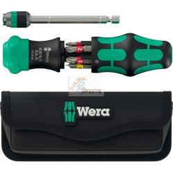 Wera Kraftform Kompakt 25 RA-R con borsaIl Wera Kraftform Kompakt 25 RA-R è un cacciavite versatile con meccanismo a cricchetto integrato, che consente un lavoro veloce grazie alla sua trasmissione fine. La lama telescopica può essere abbassata o rimossa dall'impugnatura, consentendo di utilizzare l'utensile sia in spazi ristretti che come portapunte per macchine. Inoltre, il set dispone di un caricatore di punte integrato con sei punte da 25 mm e viene fornito in una pratica borsa da cintura. Caratteristiche: