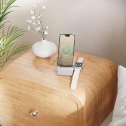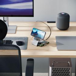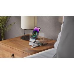 La stazione di ricarica 3 in 1 è sia un supporto magnetico che una stazione di ricarica wireless in grado di caricare fino a tre dispositivi contemporaneamente. Il dispositivo di ricarica compatibile con Qi ha una rientranza in cui gli AirPods e gli AirPods Pro possono essere caricati con 5 watt. L'adattatore di ricarica USB-C rimovibile per l'Apple Watch offre spazio anche per la ricarica fino a 7,5 Watt. La stazione di ricarica è dotata di un supporto di ricarica magnetico al quale è possibile caricare e fissare in modalità wireless gli smartphone compatibili con MagSafe e i dispositivi compatibili con Qi grazie all'adesivo magnetico in dotazione. Durante il processo di ricarica fino a 15 Watt (iPhone fino a 7,5 Watt), lo smartphone può essere allineato e utilizzato in formato verticale o orizzontale.