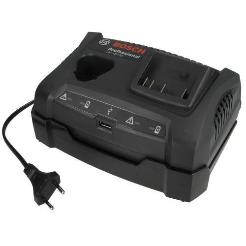 Il caricabatterie professionale Bosch GAX18V-30 è progettato per la ricarica sequenziale di pacchi batteria Li-Ion da 10,8/12 V e 14,4/18 V, con corrente di carica fino a 3 A. Include una doppia bay e una porta USB integrata per ricarica di dispositivi mobili, ideale per officina e cantiere.