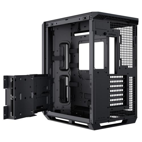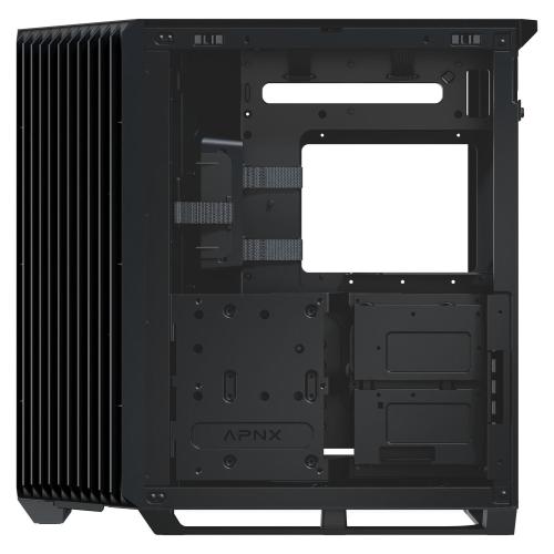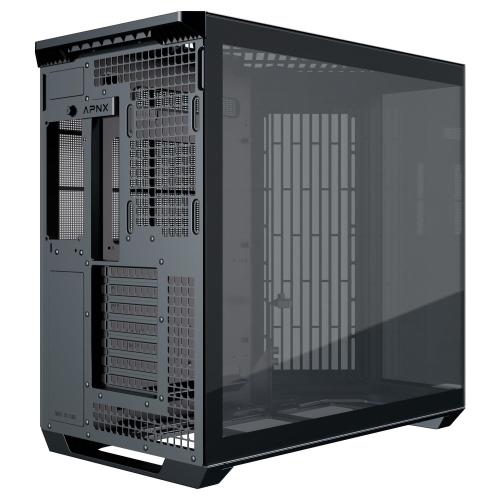IlAPNX V1utilizza un design a doppia camera con un'esclusiva presa d'aria angolata a 45 gradi, che massimizza il raffreddamento per GPU e CPU. Progettato per strutture di grandi dimensioni, il case offre spazio per schede grafiche fino a 395 mm di lunghezza e dispositivi di raffreddamento della CPU fino a 170 mm di altezza.
