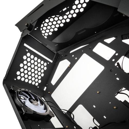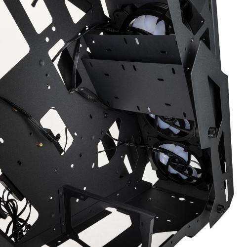 primed for water-cooling loops, especially with dual-radiators. There is support for up to a 360mm radiator upon the front panel and a second 240mm radiator on the roof. Thanks to the innovative and unusual design, a custom water-loop will not only work best but also look phenomenal within this chassis.