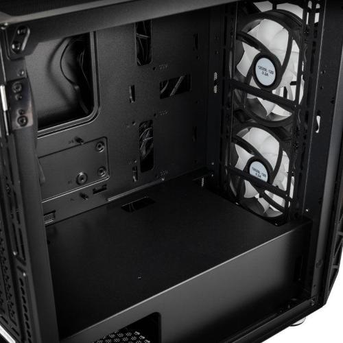 The interior comes entirely in black, with a PSU shroud that only adds to the sleek and unobtrusive look. Behind the shroud is where users will find space for a pair of 3.5" HDDs in the HDD cage provided. Alternatively, 2.5" SSDs can be installed here, or next to the motherboard. The motherboard tray and PSU shroud both offer numerous openings for optimum cable management, with up to 24mm cable management space. Underneath the case is a removable dust filter suitable for an ATX PSU up to 200mm.