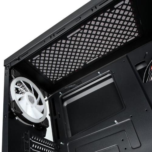 up to six 120 mm fans. Four of these, with addressable RGB lighting, come pre-installed in the front and rear of the case, while two further fans can be installed at the top at a later time. The case is also well-designed for holding radiators, and these can be up to 360 mm in size in the front of the case and up to 120 mm in the rear.