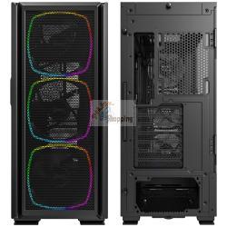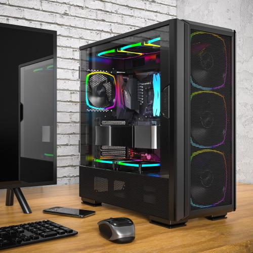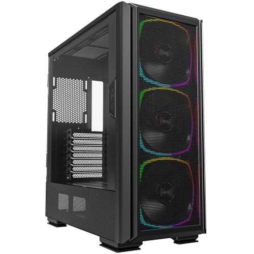 SKY TWO GX è dotato di 3 ventole AX140 ARGB PWM nella parte anteriore, che garantiscono una combinazione di flusso d'aria elevato e bassi livelli di rumore. La velocità della ventola è regolabile tramite la funzione PWM, consentendo la sincronizzazione con la scheda madre per un display luminoso personalizzato.