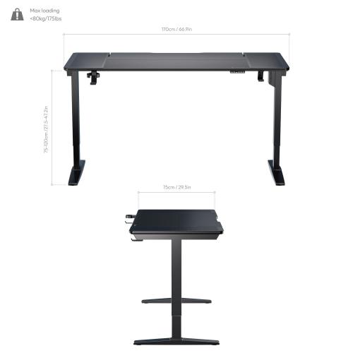 La scrivania ergonomica con motore LAB-X è dotata di un desktop da 170x75 cm con tappetino per mouse in vetro temperato e regolazione dell'altezza motorizzata da Da 75 a 120 cm per transizioni fluide e silenziose. Il suo abbassamento automatico anticollisione garantisce sicurezza, mentre la piastra laterale in rete migliora la presa d'aria del PC. Con un binario con telaio in alluminio per una personalizzazione completa fai-da-te, questa scrivania combina funzionalità e flessibilità per formare la postazione perfetta per giocare, lavorare, studiare e altro ancora.