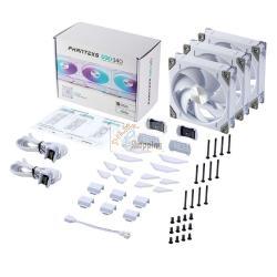 Le ventole possono essere collegate utilizzando due clip sui lati, uno dei quali convoglia l'alimentazione dalla prima ventola a un totale di quattro. Ciò riduce l'ingombro dei cavi, poiché solo la prima ventola deve essere collegata al controller Phanteks tramite un cavo PWM a 4 pin e un cavo JST D-RGB a 3 pin. È incluso un cavo adattatore D-RGB a ARGB a 3 pin per il collegamento diretto alla scheda madre.