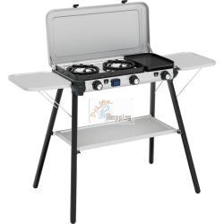 Campingaz Camping Kitchen 2 Multi Cook Plus - Fornello da campeggioIl Camping Kitchen 2 Multi Cook è un versatile fornello da campeggio e grill in uno. Con tre bruciatori indipendenti è possibile regolare individualmente il calore e cuocere, arrostire e arrostire contemporaneamente. Grazie alla tecnologia FLAMEGUARD, offre una protezione ottimale dalla fiamma anche in caso di vento. Dopo l'uso, la presina e la piastra grill possono essere rimosse per una facile pulizia. Il Multi Cook può quindi essere riposto in sicurezza con coperchio e cerniere rinforzate. Caratteristiche: