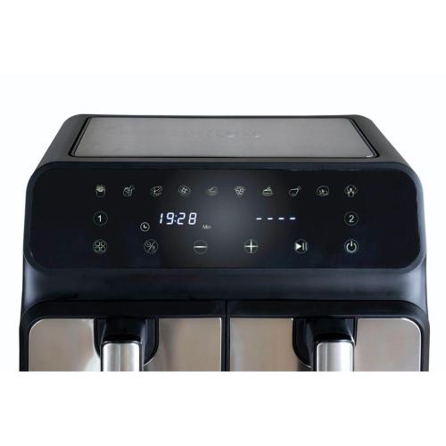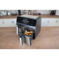 Friggere, grigliare, cuocere, arrostire, disidratare, cuocere al forno, tenere in caldo, riscaldare, scongelare e arrostire - e sempre senza olio: la friggitrice ad aria calda Twin Zone senza BPA con due camere lo rende possibile. Con i suoi 1700 Watt di potenza e una capacità totale di 8 litri (4 litri per cestello), potrai preparare fino a 1 kg di patatine croccanti. La tecnologia twin-zone permette addirittura di preparare due piatti diversi con zone di cottura indipendenti. Le griglie e i cestelli sono rimovibili per una facile pulizia, anche in lavastoviglie. Altri vantaggi: timer da 60 minuti, piedini antiscivolo, spegnimento automatico e di sicurezza.