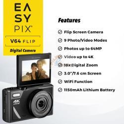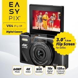 Fotocamera digitale ribaltabile Easypix V64Libertà creativa e facilità d'uso: vuoi fare un bel selfie? Basta aprire lo schermo da 3 pollici, girarlo e premere il pulsante. Con foto fino a 64 megapixel e video 4K, ottieni risultati nitidi. For detailed shots Trasferisci facilmente i tuoi dati Caratteristiche: