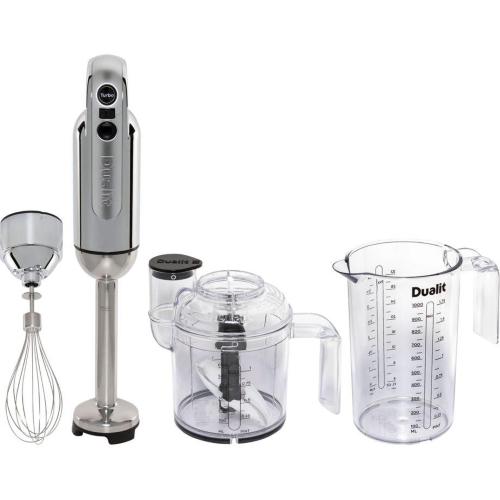 Frullatore a immersione Dualit - Confezione regalo, lucidoCon il Frullatore a immersione Dualit - Confezione Regalo non ci sono limiti alla tua creatività in cucina. Scopri la versatilità e le prestazioni del frullatore a immersione Dualit - Confezione regalo, l'aiuto in cucina definitivo per tutte le tue esigenze culinarie. Questo set non è solo uno strumento pratico, ma anche un regalo elegante per ogni appassionato di cucina. Il frullatore a immersione Dualit - Confezione regalo è dotato di un potente motore da 700 watt che gestisce senza sforzo una varietà di attività, dalla preparazione di zuppe e frullati al tritare verdure e montare la panna. Impugnatura ergonomica: offre comfort e controllo durante l'uso Tecnologia anti-aspirazione: impedisce che si attacchi alla base del contenitore Accessori versatili: include un bastoncino per frullare, una ciotola per tritatutto da 0,6 litri, una frusta e una caraffa per frullatore da 1 litro. Impostazioni di velocità multiple: ti consentono di adattarti a diversi tipi di preparazione Parti lavabili in lavastoviglie: per una facile pulizia (eccetto trasmissione e motore) Caratteristiche tecniche:
