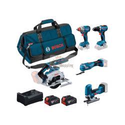 - Trapano a Avvitatore BOSCH GSR 18V-65 - Avvitatore a massa battente BOSCH GDX 18V-285 Professional - Sega Circolare BOSCH GKS 18V-57-2 Professional + Lama per sega circolare, Standard for Wood + Guida parallela - Utensile Multifunzione BOSCH GOP 18V-34 Professional +Lama per tagli dal pieno StarlockPlus, Curved-Tec, Wood + Metal - Seghetto Alternativo BOSCH GST 18V-125 S Professional + Lama per seghetto alternativo T 144 D, Speed for Wood + Protezione antischegge + Set di aspirazione delle polveri - 2 Batterie18V 5,0 Ah - CaricabatterieGAL12V/18V-80 - Borsa per il trasporto |
