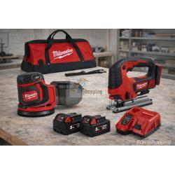 - Seghetto Alternativo Milwaukee M18BJS + Copertura scarpa in plastica + Lama + Adattatore aspirazione + Copertura da polvere - Levigatrice Rotoorbitale Milwaukee M18BOS125 + Borsa per la polvere + Adattatore per vuoto + Estensione + 2 dischi abrasivi - 2 x M18B5 18V 5,0Ah - Caricabatterie M12-18 FC - Borsa |