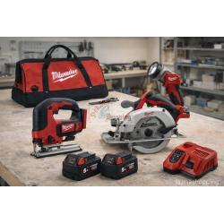 - Sega Circolare Milwaukee HD18CS + Lama di sega circolare 24 denti + Guida parallela + Chiave Allen - Seghetto Alternativo Milwaukee M18BJS + Copertura scarpa in plastica + Lama + Adattatore aspirazione + Copertura da polvere - Torcia Milwaukee M18TLED - 2 x M18B5 18V 5,0Ah - Caricabatterie M12-18 FC - Borsa |