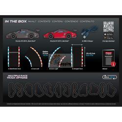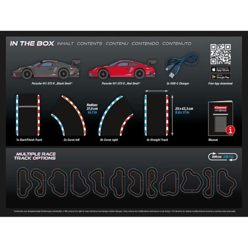 The Carrera Hybrid - Devil Drivers Set has everything you need for an exciting racing adventure. In addition to the two detailed Porsche 911 GT3 R models "Black Devil" and "Red Devil", the set includes a multi-configurable race track. The combination of a start/finish straight, four straight sections as well as eight right-hand and two left-hand corners allows for a varied and dynamic race. The included two USB-C charging cables keep the vehicles ready to race. This set combines advanced technology with the pure pleasure of racing.