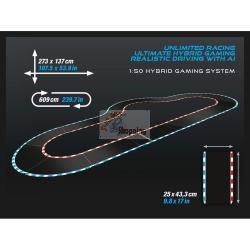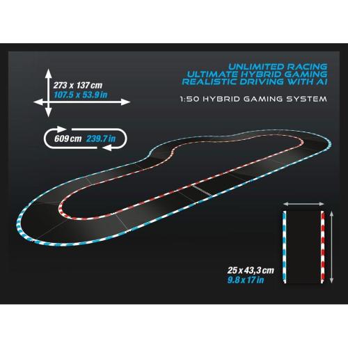 With its length of 6.09 metres, the race track of the Carrera Hybrid - Devil Drivers Set offers a wide range of possibilities for a realistic racing experience. Built on an area of, for example, 268 cm x 136 cm, it allows for versatile and realistic racing. The combination of straights and corners forms the ideal basis for dynamic and exciting races that require both skill and strategic thinking. This racetrack is more than just a toy – it's an arena for thrilling racing adventures and tactical skill!
