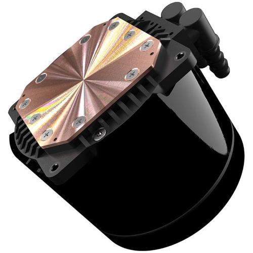 un'ampia superficie con microcanaliper un rapido trasferimento del calore al liquido di raffreddamento. La pompa del dispositivo di raffreddamento funziona tra 1200 e 2550 giri al minuto, rendendolo adatto sia per il funzionamento silenzioso che per l'overclocking. Raggiunge un