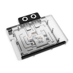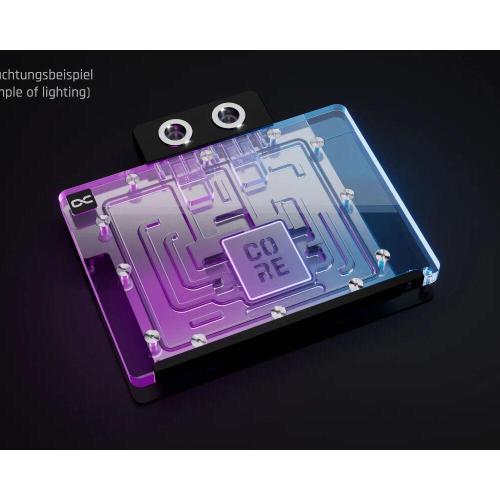 con illuminazione RGB integrata. La piastra posteriore nera è realizzata in alluminio, contribuendo alla dissipazione del calore. Il terminale di collegamento nella parte anteriore ha quattro filettature G1/4", con entrata e uscita chiaramente contrassegnate.Nota