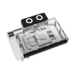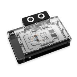 La copertura è realizzata inacrilico trasparentecon illuminazione RGB integrata. La piastra posteriore nera è realizzata in alluminio, che aiuta anche nella dissipazione del calore. Il terminale di collegamento situato nella parte anteriore ha quattro filettature G1/4 pollici. Ingresso e uscita sono chiaramente contrassegnati.