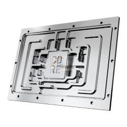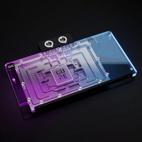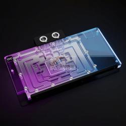 La copertura è realizzata inacrilico trasparentecon illuminazione RGB integrata. La piastra posteriore nera è realizzata in alluminio, che aiuta anche la dissipazione del calore.Quattro connessioni G1/4 polliciconsentono l'integrazione nel sistema di raffreddamento ad acqua.
