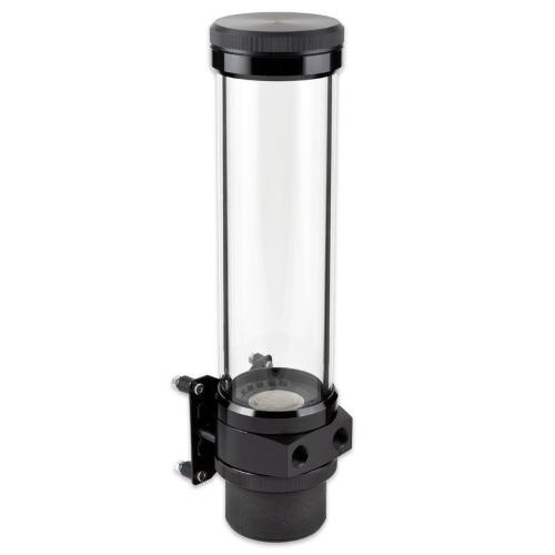 Il tubo di vetro ha uno spessore di parete di 5 mm e un diametro esterno di 65 mm. Nella base del serbatoio è integrato unfiltro in rete metallica di acciaio inossidabile. Il filtro cattura le particelle ed elimina le fastidiose bolle d'aria. L'elemento filtrante è facilmente rimovibile e può essere pulito sotto l'acqua corrente. La guarnizione nel coperchio del serbatoio è progettata come uno stampo in gomma per un facile montaggio e un posizionamento sicuro quando si avvita il coperchio.