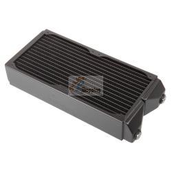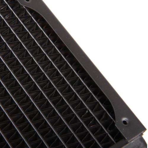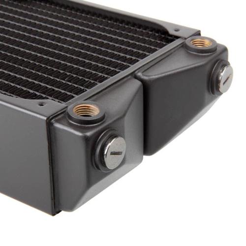 La struttura delle alette (poiché è realizzata a mano) è di circa 7 FPI (alette per pollice). Ciò consente ai ventilatori di funzionare a bassa velocità e soddisfa gli amanti dell'ultra silenziosi. Con uno spessore di 60 mm, assicurarsi che ci sia spazio sufficiente durante l'installazione. Inoltre, in questo modo viene aumentata la potenza di raffreddamento. I radiatori hanno quattro filettature G1/4" sulla parte anteriore per rendere più flessibile il collegamento del tubo.