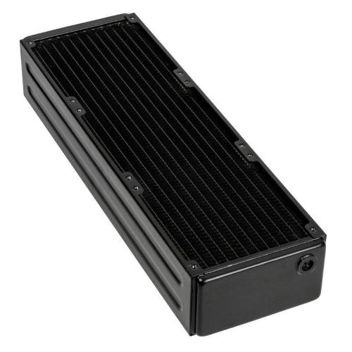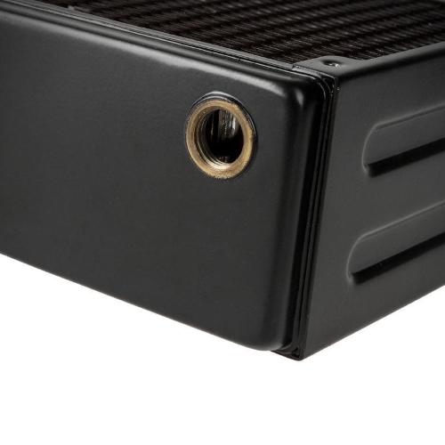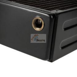 I ventilatori possono essere montati su un lato o su entrambi i lati, quindi nella variante tripla qui offerta è possibile utilizzare fino a sei unità nel formato 120 mm. Per garantire che nessuno dei tubi possa essere danneggiato accidentalmente durante il collegamento delle ventole, i tubi non si trovano direttamente sotto i fori UNC-6-32. Se utilizzato correttamente, Coolgate offre una garanzia del produttore di tre anni.