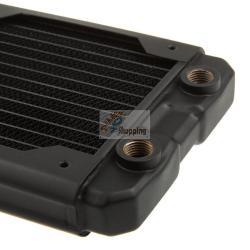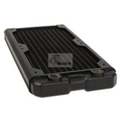 Il design è pensato per il montaggio della ventola su un solo lato, il che significa che il doppio radiatore qui offerto, il Black Ice Nemesis GTS 240, può ospitare due ventole da 120 mm. Convenientemente, i fori di montaggio filettati M4 garantiscono un'ampia compatibilità. Inoltre, due raccordi di ingresso e uscita G1/4 pollici sono standard. Il radiatore a basso profilo presenta un nucleo in rame e camere in ottone.