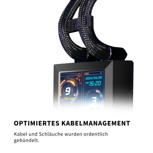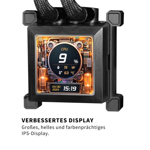Lo schermo LCD IPS da 2,88 pollici dell'HydroShift LCD 360 Silent mostra importanti informazioni di sistema con un'alta risoluzione di 480 x 480 pixel. Con una luminosità dello schermo di 500 nit, tutto rimane chiaramente visibile.