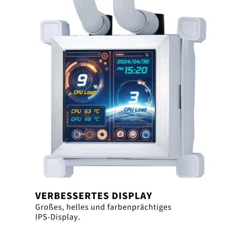 Lo schermo LCD IPS da 2,88 pollici dell'HydroShift LCD 360 Silent mostra importanti informazioni di sistema con un'alta risoluzione di 480 x 480 pixel. Con una luminosità dello schermo di 500 nit, tutto rimane chiaramente visibile.