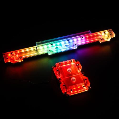 illuminazione LED RGB integrata indirizzabile digitalmentedistingue il radiatore e il refrigerante che scorre attraverso di esso dalla concorrenza. L'illuminazione viene collegata tramite un connettore RGB a 3 pin (5VDG) per essere collegata a una scheda madre compatibile, questa può essere controllata e sincronizzata tramite il software RGB del produttore della scheda madre.