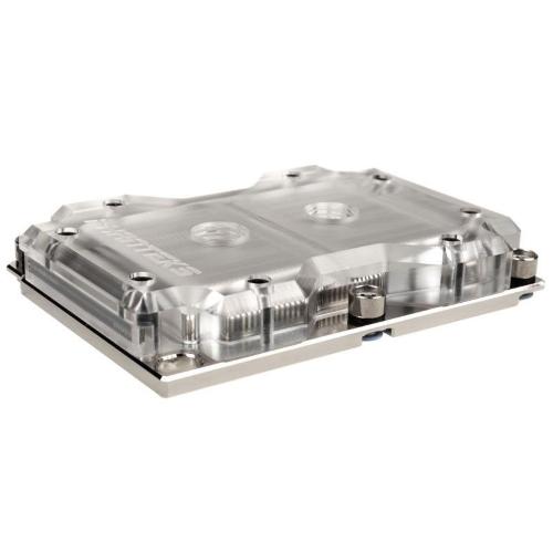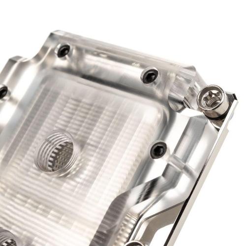 dissipatore di calore in rame nichelatocon una copertura in vetro acrilico trasparente. Le sottili alette nel dissipatore di calore aiutano a massimizzare la superficie totale, rendendo il trasferimento di calore tra la piastra di base e il refrigerante che scorre su di essa il più efficace possibile.