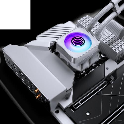 L'alloggiamento della pompa è progettato per essere funzionale e poco ingombrante: ideale per i sistemi moderni con spazio limitato attorno al socket della CPU. Grazie al design a basso profilo, la compatibilità con schede madri e moduli RAM non è compromessa. Ciò consente di utilizzare il refrigeratore d'acqua AiO in modo flessibile senza sacrificare le funzionalità.