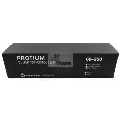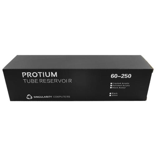 coperchio e base in acrilico satinato e nero. Il tubo ha un diametro di 60 millimetri e un'altezza di 250 millimetri; l'intero serbatoio è alto 289 mm. Il Singularity Computers Protium dispone