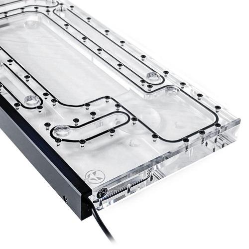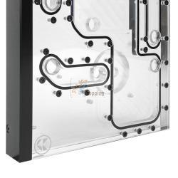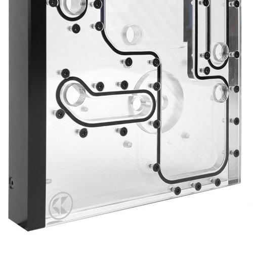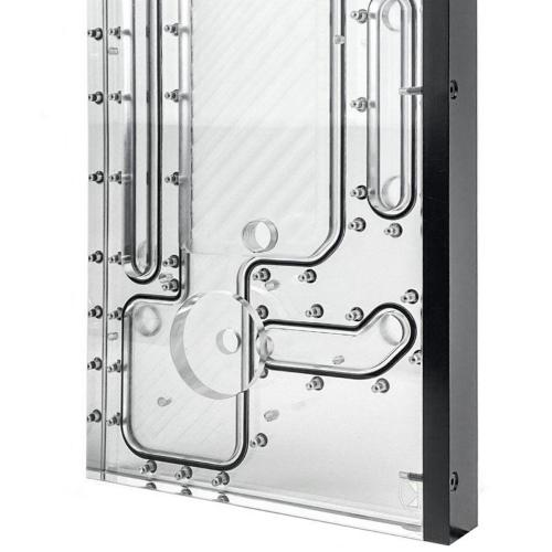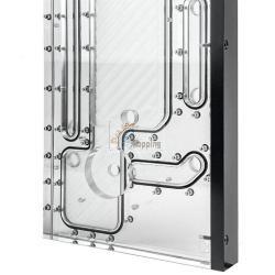 è possibile collegare due radiatori da 360 mm, nonché un dispositivo di raffreddamento della CPU e un dispositivo di raffreddamento della GPU. Le connessioni sono completate da un'apertura di riempimento e da una di scarico ciascuna. La piastra di distribuzione, progettata appositamente per il
