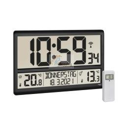 Orologio radio digitale XL con temperatura esterna e interna 60.4521Per aree di attesa, reception, uffici ed edifici pubblici, un orologio fa parte della dotazione di base. Il display ampio e molto chiaro è facile da leggere, anche a distanza. L'ora viene visualizzata in un formato particolarmente grande e sempre al secondo. Il passaggio dall'ora legale a quella invernale è automatico. Il giorno della settimana scritto e la data completa rendono l'orientamento dell'ora molto semplice e comodo. La particolarità di questo orologio è il doppio display della temperatura per l'esterno e per l'interno. La temperatura esterna viene trasmessa da un piccolo trasmettitore installato all'aperto tramite segnale radio con una portata fino a 100 metri. Il design semplice e chiaro si adatta a qualsiasi ambiente, indipendentemente dal fatto che si desideri appendere l'orologio radiofonico o posizionarlo, ad esempio, sul bancone della reception. Inoltre, il dispositivo svolge anche tutte le funzioni di una sveglia. Caratteristiche:
