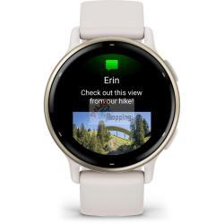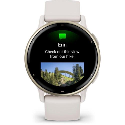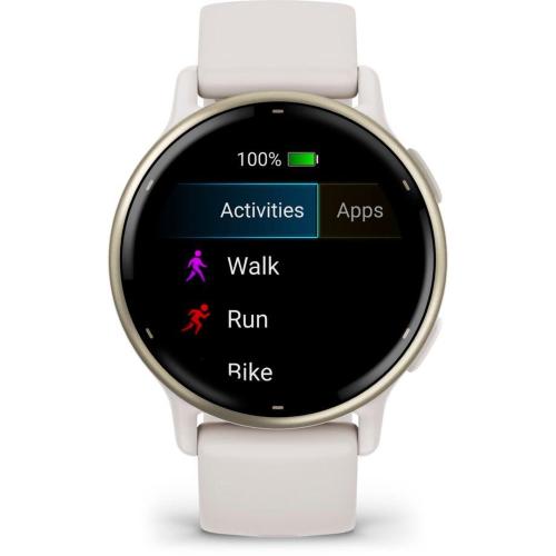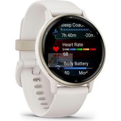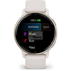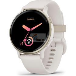 Garmin vívoactive 5 Ivory / Creme GoldWith the Vivoactive 5, you'll get to know your body better than ever before and always have a coach tailored to your individual needs. Additionally, you'll stay up to date by receiving Smart Notifications, making contactless payments with Garmin Pay, and enjoying your favorite playlists directly from your fitness smartwatch on your wrist. Body Battery: Check your energy levels throughout the day. This will help you determine whether your body has enough energy for activities or if it's time for rest and sleep. Learn more about how sleep, naps, daily activities, and high stress levels affect your energy. Sleep Coach: Receive an evaluation of your sleep and personalized coaching to determine your sleep needs and improve your sleep quality. Review different sleep phases and rest periods and receive important sleep metrics, such as HFV status, to better understand your well-being. Integrated Sports Apps: With over 30 pre-installed sports and outdoor apps, you can record your activities. You'll find apps for walking, running, cycling, swimming in a pool, wheelchair activities, and much more. Training Effect and Recovery Time: Understand how your body responds to each workout. The recovery time after exercise will let you know when you're ready for your next activity, taking into account training intensity and factors like stress, daily activities, and sleep. Morning Report: Receive a summary of your sleep, recovery, daily calendar, HFV status, and more right after waking up. Customize the report to your liking. Smart Notifications: Get messages, notifications, and calendar events directly on your smartwatch when paired with your iPhone or Android smartphone. With an Android smartphone, you can reply using the smartwatch keyboard and view photos received on the display. Nap Detection: Automatically track and store your naps. With this data, you'll know the benefits of napping, the ideal time for them, and how long they should ideally last. HFV Status: Measure your heart rate variability during sleep and gain insights into your health, recovery, and fitness through daily and 7-day average analyses. Wrist-Based Heart Rate Measurement: The Vivoactive 5 regularly measures your heart rate so you're informed day and night. Stress Level Monitoring: The Vivoactive 5 continuously monitors your heart rate so you can stay informed at all times. Women's Health: Track your menstrual cycle or pregnancy and receive information about training and nutrition. Health Snapshot: Start a 2-minute session to collect important health data. Record necessary health statistics and share them with your doctor. From here, you can create a report to share with your physician. Pulse Oximeter Sensor: Measure blood oxygen saturation with pulse oximetry to exclude breathing problems during sleep. Meditation: Audio-guided meditation exercises can help reduce stress, anxiety, and other emotional burdens. Conscious Breathing: Start a breathing exercise and learn more about stress and breathing. Hydration Tracking: Save your daily water intake as a reminder to drink enough water. Breathing: Monitor your breaths during the day, during sleep, during breathing exercises, and during yoga. Wheelchair Mode: Track your daily pushes, get sports apps, and receive alarms for weight shifts. Garmin Coach: Receive free, flexible training plans for 5K, 10K, and half-marathons from experienced coaches. Fitness Age: Use your age, weekly activity, resting heart rate, and BMI or body fat percentage to calculate whether your body is younger or older than you are. Create Workouts: Create step-by-step workouts in the Garmin Connect app using over 1,600 exercises and send them directly to your smartwatch. Activity Announcements: Get instructions directly from your smartwatch during running and walking activities. Never miss important information and always stay on the right track. Create Intervals: Create your own interval training for running and cycling activities. Perceived Exertion: Provide brief feedback on the level of exertion and how you feel after each workout. Intensity Minutes: Record your moderate and vigorous activity minutes. Fitness Tracking: Keep an eye on your daily steps, calorie consumption, and more using your smartwatch. VO2 Max: View your current fitness level and track long-term changes to set goals, assess your progress, and more (not available in wheelchair mode). Always Up-to-Date Garmin Connect App: The Garmin Connect app provides information about your health, fitness, and activities. You can update your smartwatch, receive insights, and become part of the community. Garmin Pay: Enjoy the convenience of going cashless on the go. Simply make contactless payments with your smartwatch at participating providers. Music: Download songs and playlists from your Spotify, Amazon Music, or Deezer account to listen to music without your smartphone. Safety and Tracking: If you feel unsure or your smartwatch detects an accident, a message with your current location is sent to emergency contacts. Image Display: You can view photos received on your Android smartphone directly on the display of your smartwatch. Connect IQ Shop: Download watch faces, data fields, and apps to your paired smartwatch. Two Font Sizes: Choose a font size that's easy for you to read to make all information easily understandable. Features: