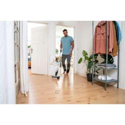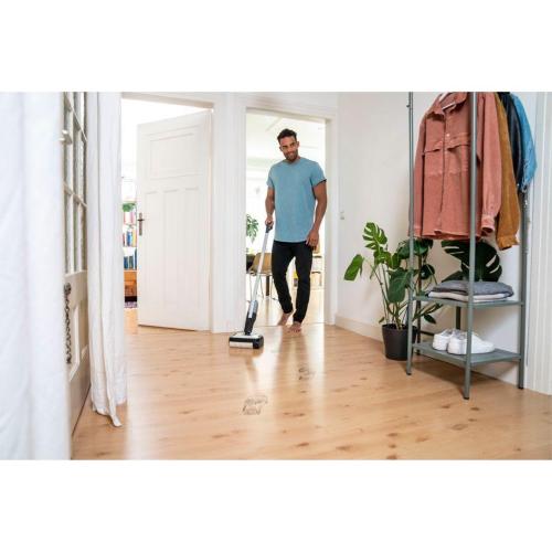 Kärcher Hard Floor Cleaner FC 2-4 Battery SetSimple, fast and effective cleaning: The FC 2-4 floor cleaner removes both dry and wet daily dirt in one step. Includes exchangeable battery and battery charger. The FC 2-4 floor cleaner impresses with its self-supporting design, a low weight of only 2.2 kilograms and automatic switching on and off. To do this, pull the handle of the cleaner backwards to start and remove dry and wet daily dirt very conveniently in just one step. The maximum battery life is 20 minutes, which corresponds to a cleaning area of 70 square metres. After the device is activated, the roller is automatically moistened with the water from the fresh water tank. This ensures even and effective cleaning of hard floors. Further features are cleaning right up to the edge and the easy collection of hair thanks to integrated hair filters. Contact with dirt is also avoided by the integrated, hygienic waste water tank. This can be removed and cleaned directly after using the device. The included 4 V Kärcher Battery Power exchangeable battery is compatible with all 4 V Kärcher Battery Power devices. All-in-one: Removes all kinds of dry and wet everyday dirt in a single step Wiping is 20% cleaner than with a mop and much more convenient Automatic on/off switch 4 V Kärcher Battery Power Parking position Lightweight with compact dimensions Easy device cleaning Flexible double joint Application areas: