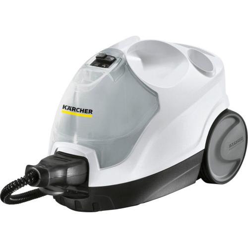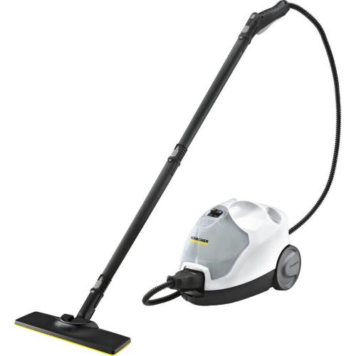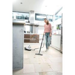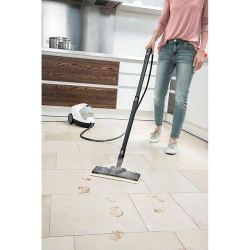 Kärcher SC 4 EasyFix Iron white / blackThe extremely convenient SC 4 EasyFix Iron cleans without chemicals and can be used anywhere in the home. The steam intensity can be adjusted to the surface and dirt thanks to the 2-stage steam regulation. Thorough cleaning with the Kärcher steam cleaner eliminates up to 99.999 % of viruses1 and 99.99 % of all common household bacteria2 on standard household hard surfaces. On tiles, hobs, extractor hoods and even in the smallest crevices, the appliance ensures exemplary cleaning results with the right accessories. Even stubborn dirt is reliably removed. The included steam pressure iron can save 50 percent of the usual ironing time. The EasyFix floor nozzle impresses with a flexible joint for maximum ergonomics and lamella technology for perfect cleaning results. Thanks to the convenient Velcro system, the floor cloth can be quickly and easily attached to the floor nozzle and removed without coming into contact with dirt. The removable water tank is permanently refillable - for uninterrupted cleaning. Further equipment details: integrated cable compartment, accessory storage compartment, parking position for the floor nozzle. 1 When spot cleaning with the Kärcher steam cleaner, i.e. a steaming time of 30 seconds at maximum steam level with direct contact with the surface to be cleaned, 99.999 % of enveloped viruses, such as influenza viruses (with the exception of the hepatitis B virus), can be removed from standard household, smooth hard surfaces (test germ: modified vaccinia virus Ankara). Permanently refillable removable water tank EasyFix floor cleaning set with flexible joint at the floor nozzle and comfortable Velcro fastening of the floor cloth Compartment for cable storage Steam pressure iron EasyFinish: Iron with fixed temperature setting, automatic switch-off and smooth soleplate. Up to 50 % time saving. Multifunctional accessory equipment: Cleaning of various surfaces as required by floor nozzle, hand nozzle, round brush and much more. Floor cloth and cover for the hand nozzle made of high-quality microfibre: For thorough cleaning results and even better loosening and absorption of dirt. Child safety on the steam gun: A locking system offers safe protection against improper use by playing infants. 2-stage steam quantity regulation: The steam quantity can be individually adjusted to the respective surface and degree of soiling. Accessory storage and parking position: Comfortable accessory storage. Park position for easy parking of the floor nozzle when work is interrupted. Features: