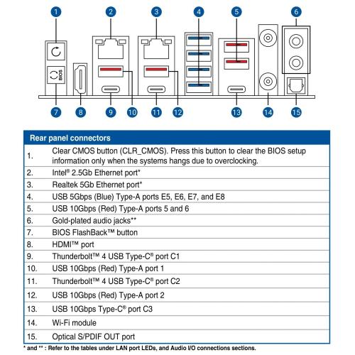 | Besonderheiten | Condensatori solidi+audio, LED diagnostico (indicatore LED), LED diagnostico (segmentazioni), I/?O-Blende integriert, Backplate, 6x M.2-Passivkühler, interne Anschlüsse rückseitig (ASUS Advanced BTF) |
