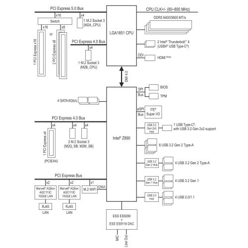 | Collegamento Esterno | 2x Thunderbolt 4 /? USB4 con DisplayPort 1.4 (40Gb/?s, PD-Out, HDCP 2.3, iGPU), 10x USB-A 3.1 (10Gb/?s), 2x 3.5mm Klinke (ESS ES9280), 2x RJ-45 (10GBase-T, Marvell AQtion AQC113CS), 2 connettori per antenna Quick Connect |