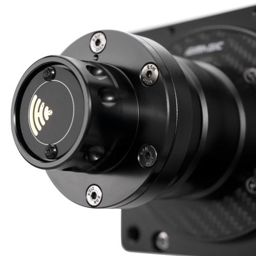 Il volante può essere montato sulla basesenza cavi aggiuntivi. Le superfici di contatto sull'albero dello sterzo consentono la trasmissione dei dati senza latenza dal volante al PC. Con unmeccanismo di sgancio rapidoopzionale, puoi fissare facilmente e rapidamente i volanti Simagic compatibili.