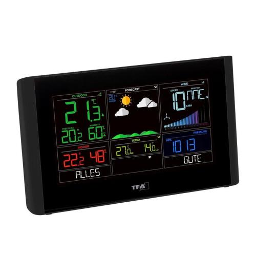 Stazione meteorologica radio con WiFi VIEW BREEZE 35.8001La stazione meteorologica wireless VIEW BREEZE con WLAN integra i tuoi dati di osservazione locale con le previsioni professionali di un servizio meteorologico online. La stazione dispone di due trasmettitori esterni: un trasmettitore termoigrometrico controlla la temperatura e l'umidità esterna e un anemometro determina la forza del vento nel luogo di installazione. I dati vengono inviati alla stazione base entro un raggio massimo di 100 m (in campo libero). Un barometro elettronico integrato misura la pressione dell'aria e l'immagine meteorologica colorata fornisce una previsione per il tempo a venire. Puoi anche tenere d'occhio la temperatura e l'umidità interna e controllare il clima interno attraverso riscaldamento e ventilazione mirati. Inoltre, VIEW BREEZE offre ulteriori informazioni come valori massimi e minimi, la temperatura percepita "wind chill", il punto di rugiada e le impostazioni di allarme per diversi parametri, nonché un orologio con data e giorno della settimana completamente scritto. Fino a 4 trasmettitori aggiuntivi, ad es. per la regolazione della temperatura e dell'umidità nella cameretta dei bambini o un trasmettitore per la piscina, possono essere visualizzati sulla stazione. Il display a colori ad alto contrasto può essere regolato su tre livelli di luminosità e oscurato automaticamente di notte. Ottieni tutte queste funzioni senza una connessione Internet; ciò significa che VIEW BREEZE può essere utilizzato anche come stazione meteorologica "autonoma" a tutti gli effetti. La stazione meteorologica è integrata nella WLAN locale tramite l'app gratuita TFA VIEW. Segui semplicemente le istruzioni nell'app. Se la stazione è collegata a Internet, il display cambia e un piccolo simbolo indica quali informazioni vengono ora importate tramite il servizio meteo online. Oltre alla forza del vento viene visualizzata anche la direzione del vento. Invece delle previsioni del tempo basate sui cambiamenti della pressione atmosferica, ora ricevi una previsione di 12 ore professionale e continuamente aggiornata per la tua regione. Puoi anche richiamare individualmente le previsioni per le prossime 12 ore o 7 giorni premendo un pulsante. Appaiono altri dettagli meteorologici interessanti, come le temperature massime e minime previste e la probabilità di pioggia. L'ora e il calendario vengono aggiornati regolarmente e puoi anche programmare messaggi personali o informazioni meteo aggiuntive da visualizzare sul display della stazione meteo tramite l'app TFA VIEW. Utilizzando l'app gratuita VIEW, la gamma di servizi è ancora maggiore: recupera i valori misurati della tua stazione meteo VIEW BREEZE da qualsiasi parte del mondo utilizzando il tuo tablet o dispositivo mobile, visualizza le registrazioni degli ultimi 30 giorni, imposta limiti di allarme ed essere informato tramite notifica push in caso di allarme. Puoi chiamare fino a 50 trasmettitori e dispositivi radio tramite l'app. I trasmettitori compatibili sono (disponibili opzionalmente): Trasmettitore termo-igro (cat. n. 30.3800.02), Trasmettitore termo-igro (cat. n. 30.3239.02), anemometro (cat. n. 30.3801.02) e piscina trasmettitore (cat. n. 30.3238.06). Caratteristiche: - Display a colori con 3 livelli di luminosità e funzione di attenuazione regolabile (funzionamento continuo solo con alimentatore)